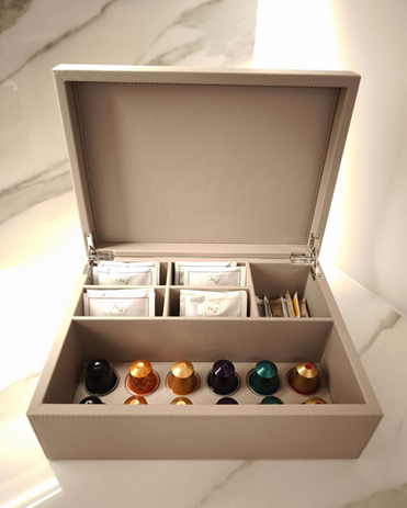 The bespoke programme covers a wide range of guest room and operational accessories, including notepad holders, bag racks, condiment boxes for tea, coffee, sugar, and minibar presentation, wardrobe organisers, and custom-dimension storage and presentation solutions.